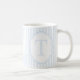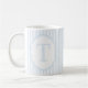 This elegant monogram mug features a soft blue and white striped design with the letter T in the center.