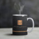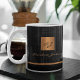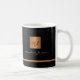 Luxuriös aussehende Büros oder persönliche mit Monogramm Kaffeemaschine Tasse mit einem Imitat Kupfer gebürstetem Metallgold Quadrat mit Ihren Monogramm Namen Initialen und einem Metall Look Stripe über einem stilvollen schwarzen Imitat Leder Textur (PRINTED) Hintergrund. ++++++++++++++ Geeignet für kleine Unternehmen, Firmenfachleute oder selbstständige Geschäftsleute, Stylist- und Markenfachleute, Makeup-Künstler oder Schönheitssalons, Boutique- oder Ladenmanager.