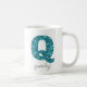 Diese gürtelige Tasse weist einen aqua-blauen Monogramm-Buchstaben Q auf und ist mit Ihrem Namen unter einem grauen Skript personalisiert.
