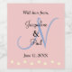 Monogramm in hellblau elegantes Drehbuch vor pastellfarbenem Hintergrund Rose. Gastgeschenke Hochzeiten mit dem Wortlaut, Mit Liebe von, setzen Braut und Groom's erste Namen, Hochzeitdatum in schwarzem Text. Kleine cremefarbene Polka dotiert unten. Original Design von TamiraZDesign.