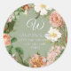 Weich minty sage grün Hintergrund kann geändert werden, um Ihre Hochzeitsfarbe Palette. Elegante Vintage botanische Kunst in einem modernen Design in lebendigen Korallen, Pfirsich, rot rosa mit weißen und Elfenbeineleganten Blume. Runder Rücksendeadresse Umschlag Aufkleber mit Ihrem Monogramm, Name und Anschrift. Perfekt um sowohl eine dekorative Touch und Siegel Umschläge für Hochzeitsfeiern und Brautparty-Party hinzuzufügen. Audrey Jeanne Roberts Urheberrecht.
