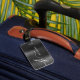 Ein elegantes Gepäckanhänger mit Drehbuch und modernem Schriftart auf einem schwarz-grauen Imitat. Das Hotel liegt in der Nähe des Stadtzentrums.