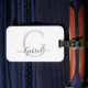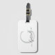 Elegantes Monogramm auf Ihrem persönlichen Gepäckanhänger. Weißer Hintergrund mit schwarzem Skript und einem silbernen Monogramm.
