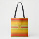 Eine moderne Designertasche mit farbenfrohen gestreiften Mustern in warmen Orangetönen und ockergelb. Sie können den Text des Monogramms anpassen oder löschen sowie das Muster skalieren oder drehen, wenn Sie möchten.