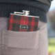 Hübsche Flasche mit dem karierten Muster klassischen und roten, schwarzen und weißen Clan Cunningham Tartan. Personifizieren Sie das Monogramm mit drei Buchstaben, auf dem Metall, das Plakette, zum Anzug Ihr Bedarf schaut. Große Geschenkidee für irgendeinen Typ und besonders groß als Hochzeits-Partygeschenk für Trauzeugen.