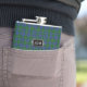 Hübsche Flasche mit dem klassischen karierten Muster blauen und grünen Johnstontartan. Personifizieren Sie das Monogramm mit drei Buchstaben, auf dem Metall, das Plakette, zum Anzug Ihr Bedarf schaut. Große Geschenkidee für irgendeinen Typ und besonders groß als Hochzeits-Partygeschenk für Trauzeugen.