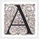 Der Buchstabe "A" der Hauptstadt ist umgeben von kunstvollen, dunklen, roten Wirbel, die wie Blume-Reben aussehen.
