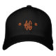 Rotes Monogramm bestickt auf einen Hut. Vorgeschlagene Basis: weißer Hut. Verwenden Sie Ihr eigenes Monogramm, indem Sie die Vorlage personalisieren. Arbeitet am besten mit zwei Buchstaben.