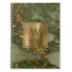Ein elegantes Notizbuch mit einem Hintergrund aus olivgrünem Marmor mit goldenen Adern. Personalisieren Sie es mit Ihrem Monogramm Initial in dekorativem Schriftart und Ihrem Namen in Kupferplatte Schrift in olivgrün auf einem bürstenbehafteten goldfarbenen Quadrat.
