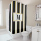 Mit diesem stilvollen Duschvorhang verwandeln Sie Ihr Bad in eine elegante Oase. Die schwarz-weißen Streifen sind mit goldfarbenen Streifen bespannt. Moderne schwarze Typografie für Ihr Monogramm ist in Gold begrenzt.