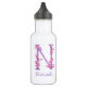 Personalisierter Brief N mit Monogramm Getränkflasche. Anpassen mit Ihrem eigenen Namen, aktuell liest Nevaeh. Andere Briefe sind verfügbar. Lila Letter-N-Monogramm, gezwirnt mit rosa Wildorchideen; Handfarbe und Design von Sarah Trett für www.mylittleeden.com