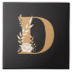 Monogramm D, hübsches Blumenmuster, Gold und Schwarz mit weißer Blume.