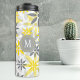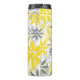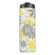 Dieser Thermotumbler zeichnet sich durch ein hübsches, gelbes, weißes und graues grafisches Blume-Muster aus. Ihr Monogramm ist weiß auf einem dekorativen grauen Kreissymbol. Grafische Design-Kredit an Malachi Designs auf Etsy.