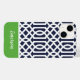 Stilvolle, individuelle Telefonzelle in marineblau, grün und weiß. Dieses Design zeichnet sich durch ein prächtiges marokkanisches Trellis-Muster aus. Personalisieren Sie es mit Ihrem Namen oder anderen benutzerdefinierten Text in einem modernen Script Monogramm Schriftart. Verwenden Sie die Designtools, um Hintergrundfarben auszuwählen, Schriftart und Farben zu bearbeiten und eigene Fotos hochzuladen, um ein einzigartiges Geräusch zu erstellen!