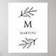 Dieses einfache und trendige Poster zeigt schwarze Illustrationen von einfachen botanischen Blätter, zusammen mit Ihrem Monogramm und Familiennamen.