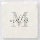 Individuell gestaltete Untersetzer aus Stein mit personalisiertem Monogramm und Familiennamen in moderner Handkalligraphie.