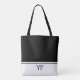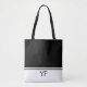 Eine weiße Band ist am Ende dieser schwarzen Tasche. Unten befindet sich ein schwarzer Bildschirmtext, den Sie personalisieren können, um das passende Monogramm anzuzeigen.