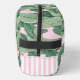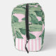 Diese Kosmetiktüte hat eine trendige Palm Beach Ästhetik mit Bananenstauden-Blätter auf einem rosa Hintergrund und einem Monogramm auf einem weißen Quadrat. Die Seiten haben ein rosa und weiße Streifen Muster in der Nähe der Unterseite.