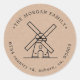 Moderner Bauernaufkleber mit einer Mühle-Illustration, umgeben mit einem personalisierten Familiennamen und Rücksendeadresse in einem eleganten Schriftart.