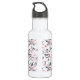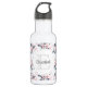Wasserflasche mit elegantem Muster aus einer Aquarellbildermalerei mit rosa Blume mit blauen grauen Blätter und Stielen. Ein weißer Kreis überlagert mit Ihrem Namen und einem Monogramm, das sich im Inneren befindet.