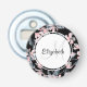 Ein Flaschenöffner mit elegantem Muster, das mit einer Aquarellbilderin von rosa Blume mit blauen grauen Blätter und Stielen versehen ist. Ein weißer Kreis überlagert mit Ihrem Namen und einem Monogramm, das sich im Inneren befindet.