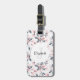 Gepäckanhänger mit elegantem Muster, das mit einer Aquarellbilderin von rosa Blume mit blau-grauen Blätter und Stielen versehen ist. Ein weißer Kreis überlagert mit Ihrem Namen und einem Monogramm, das sich im Inneren befindet.