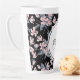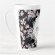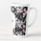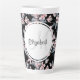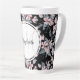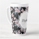 Eine latte Tasse mit elegantem Muster, die mit einer Aquarellbilderung von rosa Blume mit blauen grauen Blätter und Stielen versehen ist. Klassischer schwarzer Hintergrund. Ein weißer Kreis überlagert mit Ihrem Namen und einem Monogramm, das sich im Inneren befindet.