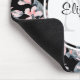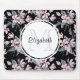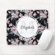Ein Mousepad mit elegantem Muster, das mit einer Aquarellbilderung rosafarbener Blume mit blau-grauen Blätter und Stielen versehen ist. Klassischer schwarzer Hintergrund. Ein weißer Kreis überlagert mit Ihrem Namen und einem Monogramm, das sich im Inneren befindet.