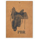 Vintage Abbildung des Reitsattels im Western-Stil auf einem Imitat-Lederhintergrund. Personalisieren Sie mit Monogramm oder Name/ Ein Design, das von denjenigen geschätzt wird, die das Cowboy Life Liebe.