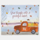 Dieses niedliche Monogramm Erntedank oder Falltuch zeigt Ihr Familienmonogramm, das auf einem rustikalen orangefarbenen LKW mit orangen und grünen Kürbissen mit dem Zitat "Danken mit einem Dankeschön" in trendiger Kalligraphie-Schrift beginnt. Diese knusprige Herbstlandschaft mit fallenden Blätter, Herbstfarben und nackten Bäumen im Hintergrund wird Sie sicher aufwärmen und Sie daran erinnern, für was Sie dankbar sein sollten. Das ist auch die perfekte Stadiondecke, um sich mit einer heißen Kürbisspitzplatte zu verweilen!