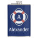 Ein nautisches Design mit einem Lifesaver-Bild mit einem Monogramm und einem Namen Ihrer Wahl auf marinebasischem Hintergrund.