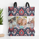 Individuell mit Monogramm Totbeutel personalisiert mit Ihren Fotos und Text. Dieses niedliche Preppy-Design hat einen ikat paisley gemusterten Hintergrund in Marine-, Koral- und Türkisfarben mit einer benutzerdefinierten 3-Fotoplastik. Fügen Sie Ihren Namen Monogramm oder anderen benutzerdefinierten Text hinzu. Verwenden Sie die Entwurfswerkzeuge, um die Textfarben und Schriftart zu bearbeiten oder um weitere Fotos hinzuzufügen, um eine der typischen Foto-Tottaschen zu erstellen.