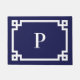 Dekorative weiße griechische Schlüssel geometrische rechteckige Grenze auf einer dunkelmarineblau 18" x 24" Türmatte mit einem modernen Serifenmonogramm. Passen Sie dieses Design an, indem Sie die Farbe Weiß oder Dunkel des Blauen mit Ihrer Lieblingsfarbe auswählen. Ändern Sie bei Bedarf den Stil, die Größe oder die Farbe des Schriftartes. Passt diesem trendigen Schatten zu eurer nautischen Wohngestaltung. Wir haben griechische Schlüsselgrenzen für die große Türmatte. Senden Sie eine Anfrage, wenn Sie ein anderes Geschenk benötigen.