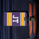 Großartiger Gegenstand für den Minnesota-Fan in Ihrem Leben. Lila, vergoldetes und weiß gestreiftes Fußball-Jersey-Design mit anpassbaren Textzeilen in lila und weiß. Die Farben, die wir für diese Serie von Taschen-Tags ausgewählt haben, werden Ihren Lieblings-Teams Farben entsprechen, wir können sie hier nicht erwähnen. Ideal für Fußballfans. Die Vorderseite des Tags hat ein individualisierbares Monogramm mit Schatten, während die Rückseite des Tags über Namen und Kontaktdaten verfügt.