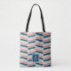 Die gemusterte Tasche mit schicken und trendigen geometrischen Herringbone-Formen zeichnet sich durch eine fröhliche Farbpalette aus Marineblau, Korallen und Meerenaqua aus. Personalisieren Sie die initiale Monogrammatik mit Ihrem Single, falls gewünscht, oder löschen Sie das erste und blaue quadratische Beispiel, wenn nicht die Monogrammatisierung.