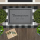 Dieses mit Monogramm Doormat ist einfach und elegant, mit dem Nachnamen Ihrer Familie in ansehnlichen Serifenschrift mit dem unten festgelegten Jahr und einem stilvollen gestreiften Rahmen-Design. Ein wunderschönes Geschenk für Neuvermählte oder neue Hausbesitzer. Enthält eine dunkelgraue Eingrauchdecke mit rustikaler Textur. Neutrale Holzkohlefarben in Grau und Schwarz können so modifiziert werden, dass sie sich mit Ihrer Wohngestaltung abstimmen.