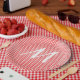 Das rote und weiße Gingham-Muster mit weißer Monogramm Monogramm kann bearbeitet werden, ebenso die Farbe
