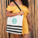 Dieses schicke, schwarz-weiß gestreifte Taschentuch wird mit dem doppelten Monogramm auf einem türkisfarbenen Abzeichen im Aquakreis personalisiert. Das Design zeichnet sich durch eine breite, waagerechte schwarze Streifen auf der Unterseite aus, die von einem Wasseranker-Abzeichen mit Ihren Initialen begleitet wird. Die Streifen wiederholen sich auf der Rückseite.
