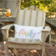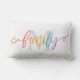 Weiße Kissen im Freien mit einer Familie, die in einem charmanten Drehbuch über Ihren ersten Schatz in einem schmackhaften Lavendel geschrieben wurde. Das Wort Familie ist in den Farben des Regenbogens geschrieben: rot, orange, gelb, grün, blau und lila.