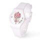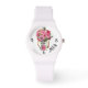 Moderne, weiße Silikon-Rundlaufuhr mit stilvollen Primzahlen. Das Gesicht zeichnet sich durch ein charmantes Design eines märchenhaften Teekessel-Hauses aus, das mit schönen rosa Rosen und kleinen grünen Blätter gefüllt ist. Der Teekessel ist mit großen grünen Punkten, einer hellrosa Tür und einem glänzenden goldfarbenen Griff und Spout geschmückt. Elegante schwarze Monogramm-Initialen können mit der Vorlage einfach geändert oder entfernt werden. Dieses Design passt zu den schwarzen und klaren Silikonuhren.