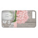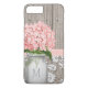 Hübsch in rosa HYDRANGEA-Kunstwerk mit Holzzaun, antikem Damast-Muster Spitzen-Hintergrund und geheftetem hellrosa Bänder Design. Das Mason-Glas mit den Blume kann mit dem ersten und dem ersten Buchstaben Ihrer Monografie mit Monogramm werden. Elegante und feminine rustikale Eleganz, Land, Bauernhof, Gartenhaus, Party oder Barnyard-Stil Details. Entworfen von Chrissy H. Studios, LLC. Alle Rechte vorbehalten.