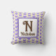 Dieses Monogramm-Kissen ist eine großartige Möglichkeit, einen farbenfrohen Akzent in Ihre Zuhause zu fügen oder einen besonderen Sake für eine Hochzeit oder eine Hauswärmung zu schaffen. Ein blaues Polka-Punktmuster erscheint vor beigefarbenem Hintergrund auf der Vorderseite und der Rückseite dieses Kissens. Der Buchstabe "N" wird zusammen mit dem Familiennamen in einem Quadrat angezeigt. Der Buchstabe und Ihr Name können schnell und einfach personalisiert werden. Original Design - C. McGouldrick
