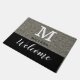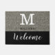 Moderne Empfangshalle mit silberfarbenem Glitzer im Look und willkommene Typografie auf schwarzem Hintergrund. Personalisieren Sie den Anfangsbuchstaben Monogramm und den Familiennamen. Das ist ein großartiges Geschenk für die neuen Besitzer und Hausbesitzer als Hauswärmer Geschenk. Sie können Ihre alte Vordertür-Matte auch durch die klassische Glitzer-Matte ersetzen!