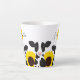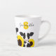 Eine Tasse aus Monogramm Latte, die Ihren Namen, Ihre Kuh-Illustrationen und Sonnenblumen enthält. Die Tasse ist in Gelb, Weiß und Schwarz gehalten. Einfach Name und Monogramm anpassen, diese Tasse in den Warenkorb legen und Kühe und Blume mit jedem warmen Getränk genießen.