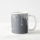Eine mit Monogramm Tasse, mädchenhaft und trendig. Ein schicker Imitat silber aussehender Hintergrund mit Imitaten Glitzer Tropfen, Farbe Tropfausdruck. Personalisieren und fügen Sie einen Namen und einen Monogrammbuchstaben hinzu. Weiße und graue Buchstaben. Der Name wird mit einem modernen handgeschriebenen Stilskript mit Swashes geschrieben. Um die Swashes behalten, löschen Sie nur den Beispielnamen, verlass die Leerzeichen oder Emoji's vor und nach dem Namen.