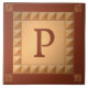 Diese warme Kachel weist eine große Hauptstadt P in einem kontrastierenden Parkettholzrahmen auf. Dekorative Motive an einer Kirschholz-Effekt-Grenze schaffen das Aussehen der Marquetrie. Das Design erfasst die Schönheit der verschiedenen Wälder wie Kirsche, Ahorn, Eiche und Asche.