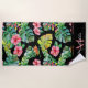 Ein farbenfrohes Strandhandtuch mit tropischem Ambiente, exotische Blume, rosa Hibiskus und Palm-Blätter auf schwarzem Hintergrund. Um Ihre Sommertage überall aufhellen zu können. Sie können es einzigartig machen, indem Sie im Menü Personalize Ihre eigene Monogram und Ihren eigenen Namen hinzufügen. Sie können mich für jede Hilfe kontaktieren.