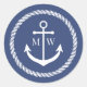 Blauer Umschlag Aufkleber für nautische Hochzeitseinladungen mit weißem Anker in einem runden Seilstreifen. Fügen Sie Ihre Initialen in einen eleganten, weißen Schriftart.