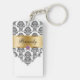 Monogramm mit hübschem Schwarz-Weiß-Damast-Muster Gold Monogramm-Emblem, das ein bedrucktes lila Diamantschmuck enthält. Personalisieren Sie Ihre Nachricht mit beliebigen Namen, Initialen oder Nachrichten als Geschenk oder Gastgeschenk. Entworfen als Schlüsselanhänger für Frauen oder Schlüsselanhänger für Mädchen, in einem lustigen zweiseitigen Acryl-Schlüsselanhänger. Lasse, dass Sie Ihre Schlüssel in Stil tragen.