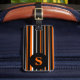 Gepäckanhänger mit schwarzen, orangefarbenen und weißen Strichcodestreifen mit Monogramm auf einem schwarzen Kreis. Personalisieren Sie Ihre Monogramm-Initial-, Name- und Adressinformationen mithilfe der einfachen Vorlagen. Schriftart, Schriftart und Schriftart sind individuell einstellbar.